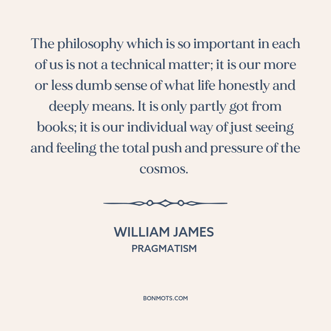 The philosophy which is so important in each of us is not a technical matter; it is our more or less dumb sense of what life honestly and deeply means. It is only partly got from books; it is our individual way of just seeing and feeling the total push and pressure of the cosmos.
