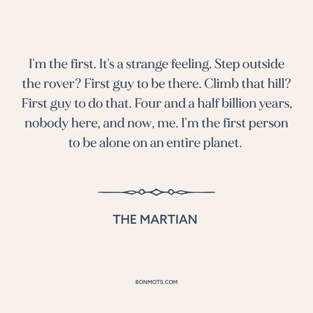 I'm the first. It's a strange feeling. Step outside the rover? First guy to be there. Climb that hill? First guy to do that. Four and a half billion years, nobody here, and now, me. I'm the first person to be alone on an entire planet.
