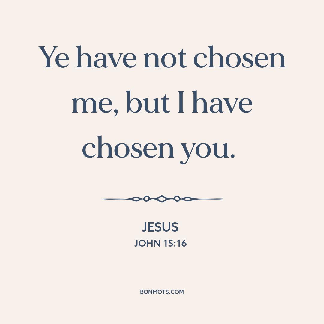 Ye have not chosen me, but I have chosen you. οὐχ ὑμεῖς με ἐξελέξασθε, ἀλλ’ ἐγὼ ἐξελεξάμην ὑμᾶς Jesus John 15:16 Buy the Bible (KJV) at Amazon Buy the Bible (KJV) at Amazon Read this verse at Bible Hub Instagram sharing coming soon. Quote text and source copied to clipboard. Link to this quote copied to clipboard. More information about this quote Topic Predestination Calvinism Speaker Jesus Source Gospel of John The Bible Medium Scripture Genre Religious literature Language Greek Time 90 90s 1st century Era Classical antiquity Occupation Founder of a religion Religious leader From Israel Middle East Roman Empire Authentication Score 3 More information on Authentication Score coming soon. Citation The Holy Bible: The King James Version. 1611. (John 15:16). Citation text copied to clipboard.