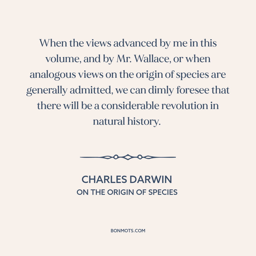 When the views advanced by me in this volume, and by Mr. Wallace, or when analogous views on the origin of species are generally admitted, we can dimly foresee that there will be a considerable revolution in natural history.