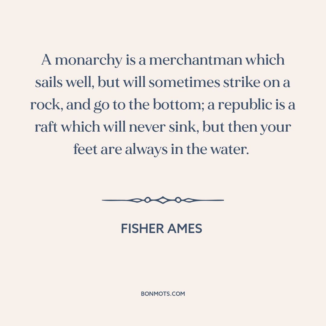 A monarchy is a merchantman which sails well, but will sometimes strike on a rock, and go to the bottom; a republic is a raft which will never sink, but then your feet are always in the water.
