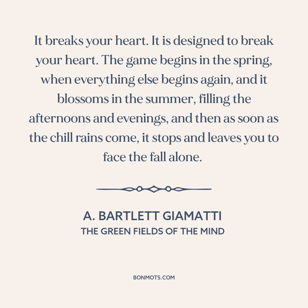 It breaks your heart. It is designed to break your heart. The game begins in the spring, when everything else begins again, and it blossoms in the summer, filling the afternoons and evenings, and then as soon as the chill rains come, it stops and leaves you to face the fall alone.