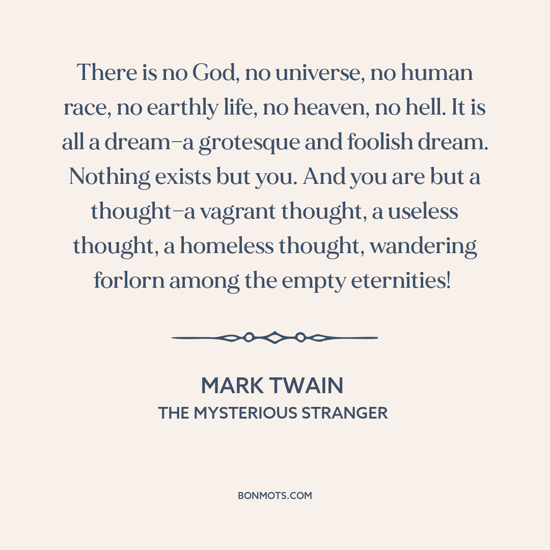 There is no God, no universe, no human race, no earthly life, no heaven, no hell. It is all a dream—a grotesque and foolish dream. Nothing exists but you. And you are but a thought—a vagrant thought, a useless thought, a homeless thought, wandering forlorn among the empty eternities!