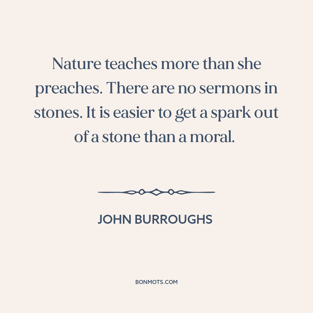Nature teaches more than she preaches. There are no sermons in stones. It is easier to get a spark out of a stone than a moral.