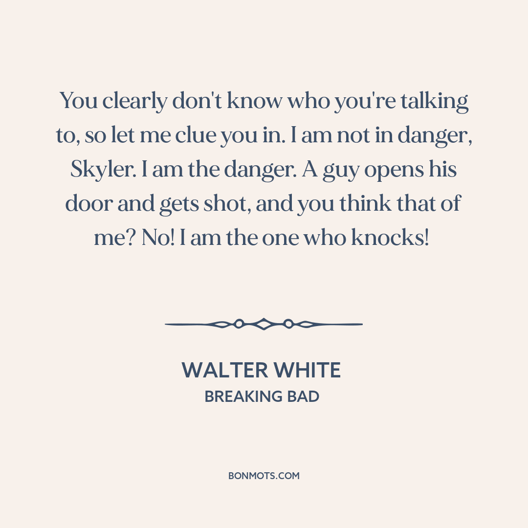 You clearly don't know who you're talking to, so let me clue you in. I am not in danger, Skyler. I am the danger. A guy opens his door and gets shot, and you think that of me? No! I am the one who knocks!