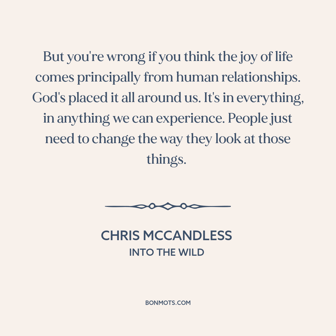 But you're wrong if you think the joy of life comes principally from human relationships. God's placed it all around us. It's in everything, in anything we can experience. People just need to change the way they look at those things.