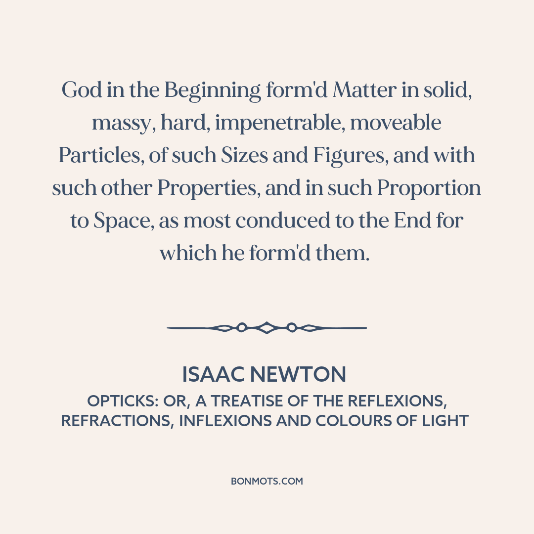 God in the Beginning form'd Matter in solid, massy, hard, impenetrable, moveable Particles, of such Sizes and Figures, and with such other Properties, and in such Proportion to Space, as most conduced to the End for which he form'd them.
