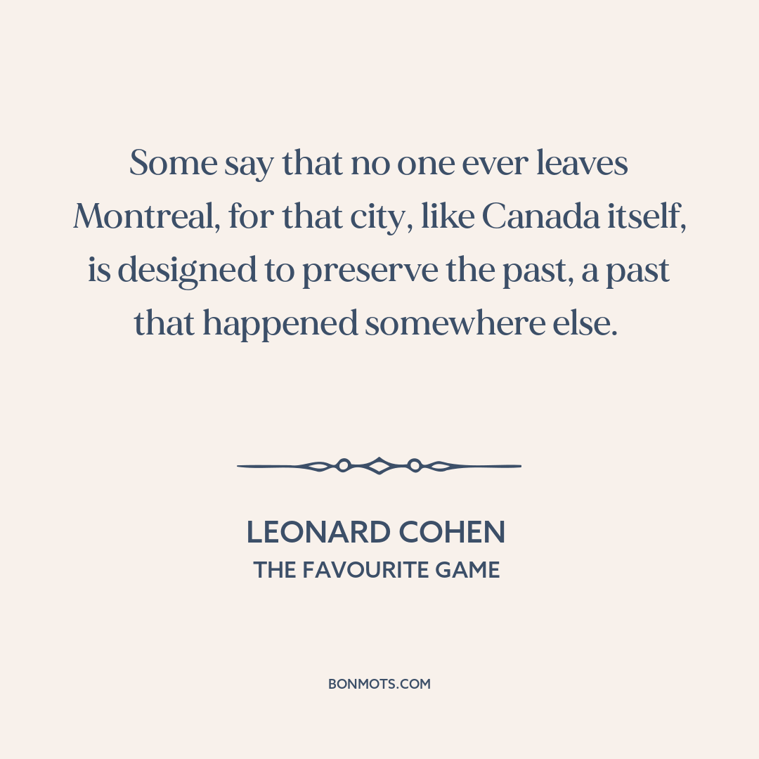 Some say that no one ever leaves Montreal, for that city, like Canada itself, is designed to preserve the past, a past that happened somewhere else.