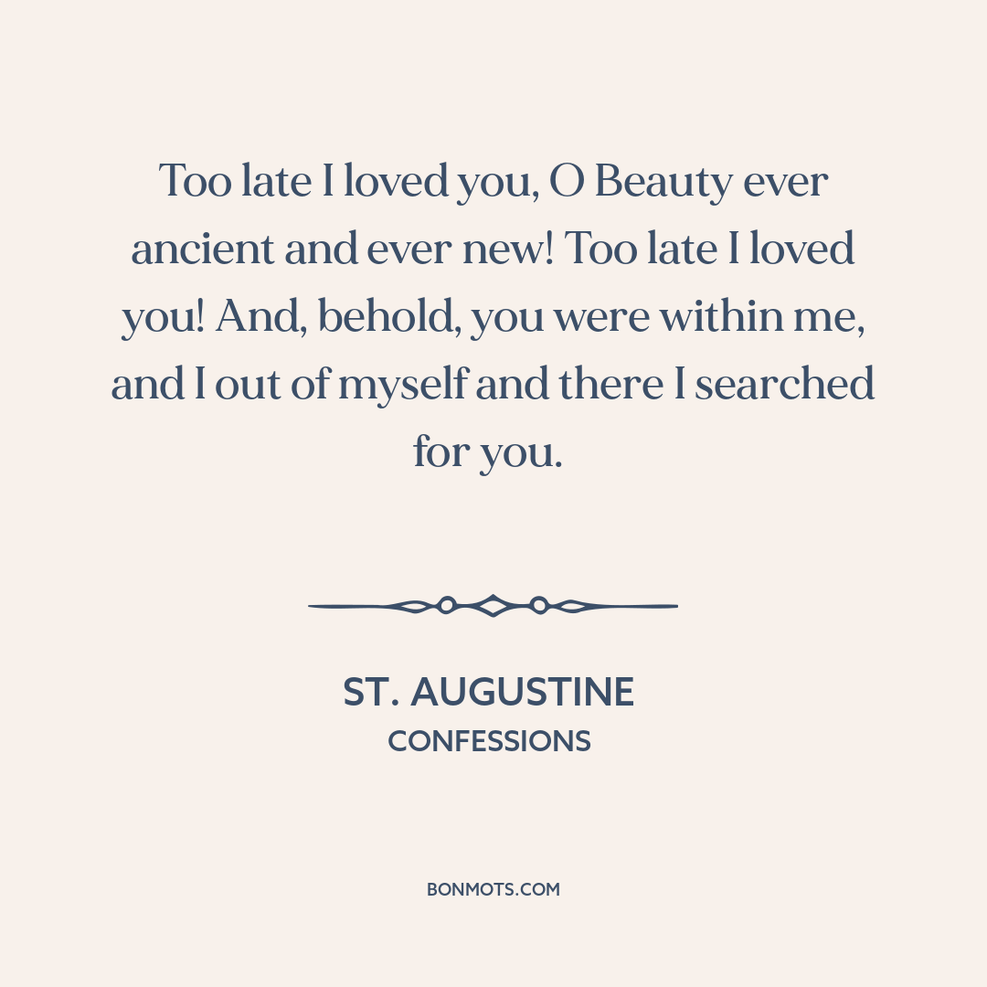 Too late I loved you, O Beauty ever ancient and ever new! Too late I loved you! And, behold, you were within me, and I out of myself and there I searched for you.