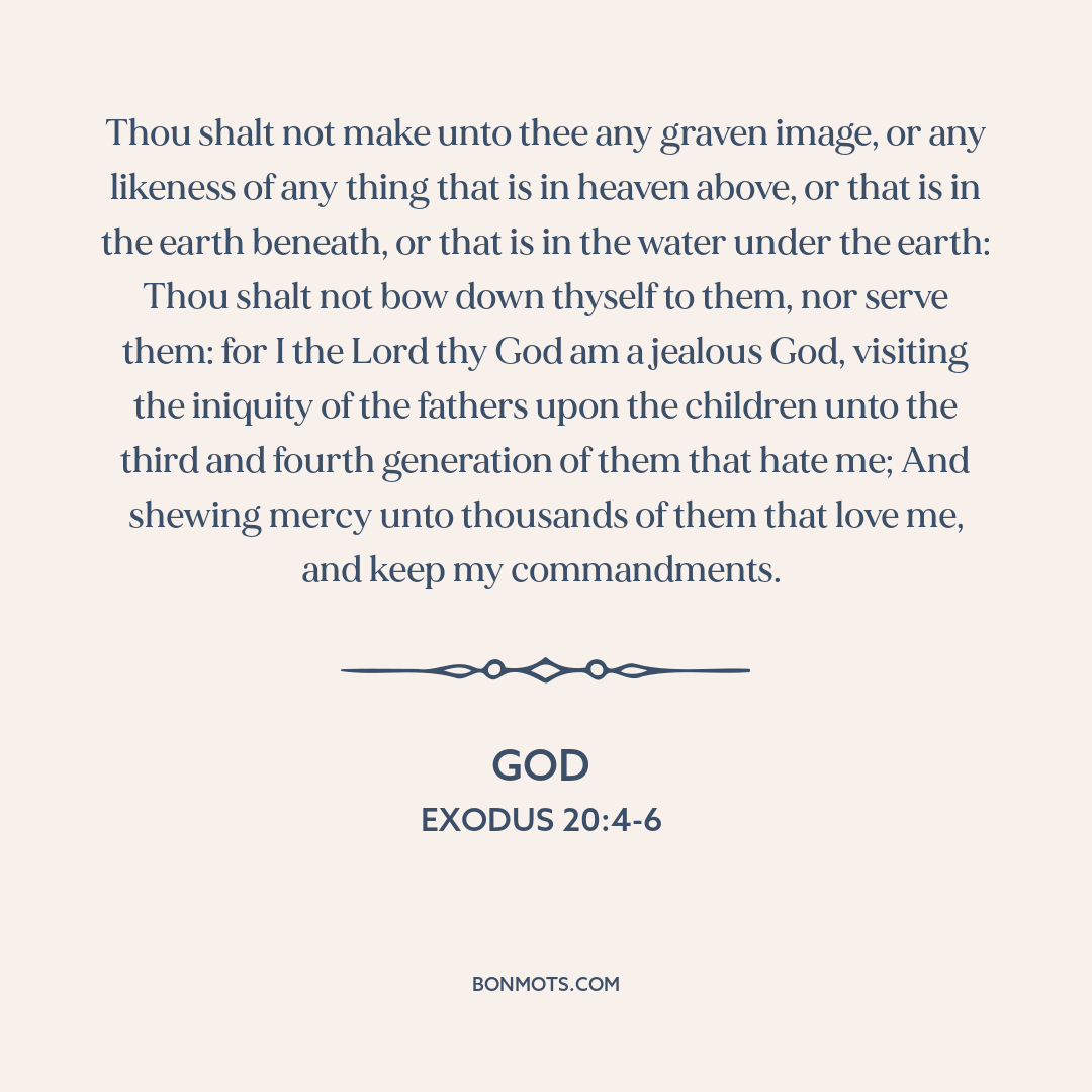 Thou shalt not make unto thee any graven image, or any likeness of any thing that is in heaven above, or that is in the earth beneath, or that is in the water under the earth: Thou shalt not bow down thyself to them, nor serve them: for I the Lord thy God am a jealous God, visiting the iniquity of the fathers upon the children unto the third and fourth generation of them that hate me; And shewing mercy unto thousands of them that love me, and keep my commandments.