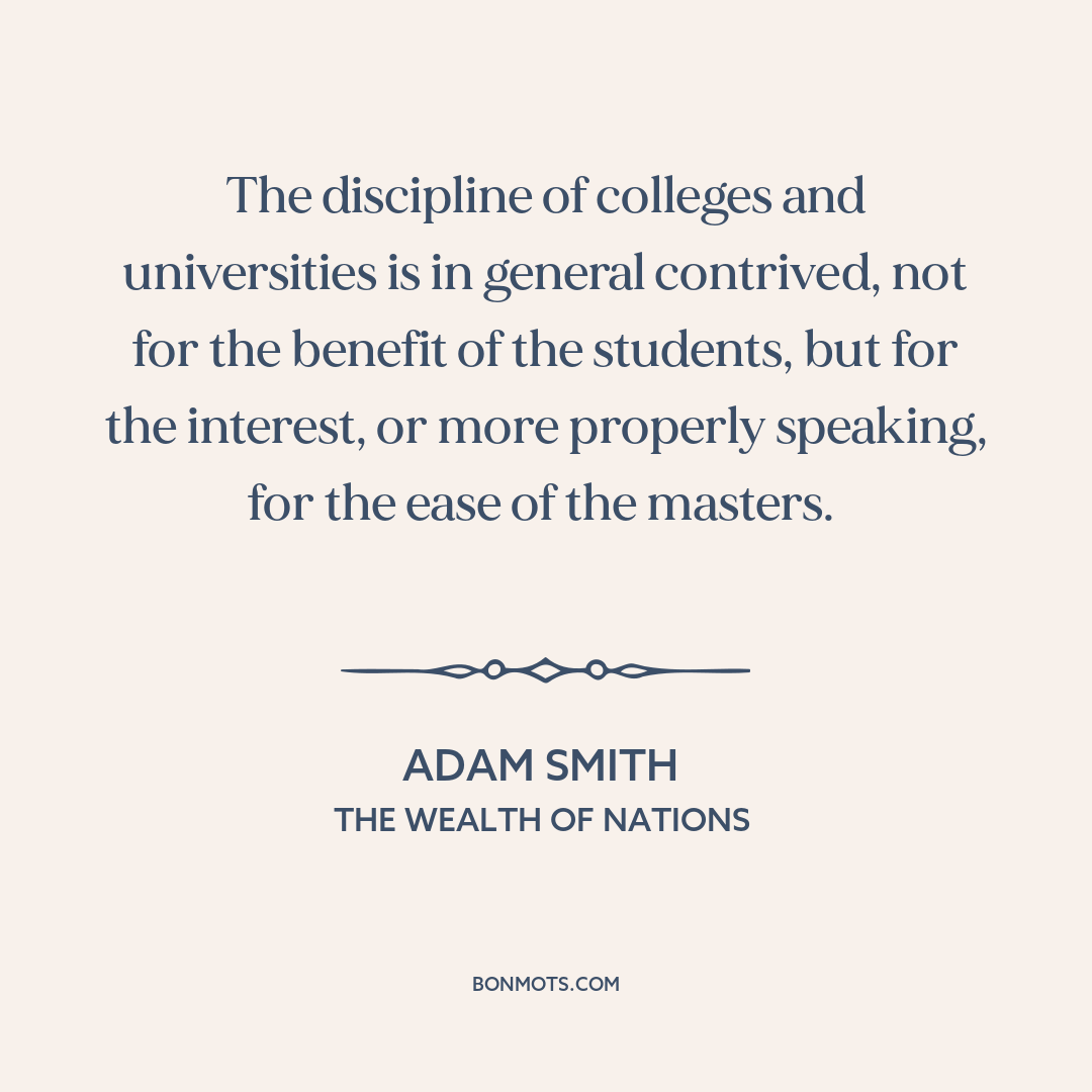 The discipline of colleges and universities is in general contrived, not for the benefit of the students, but for the interest, or more properly speaking, for the ease of the masters.
