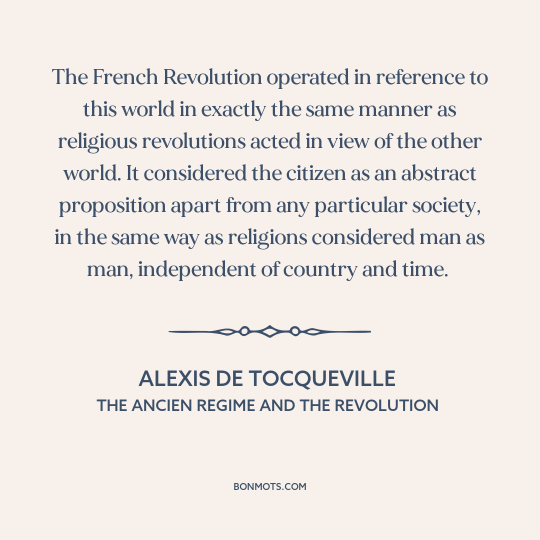 The French Revolution operated in reference to this world in exactly the same manner as religious revolutions acted in view of the other world. It considered the citizen as an abstract proposition apart from any particular society, in the same way as religions considered man as man, independent of country and time.