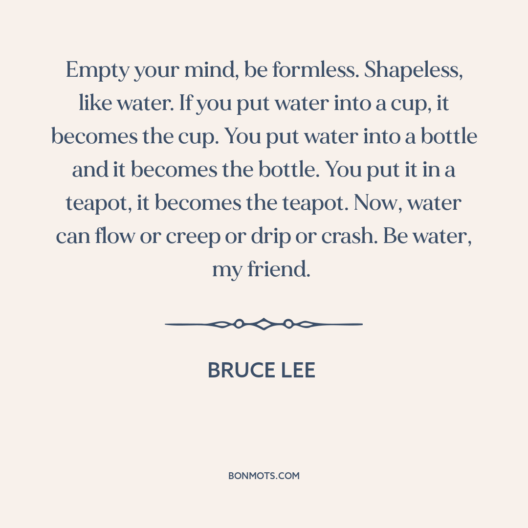 Empty your mind, be formless. Shapeless, like water. If you put water into a cup, it becomes the cup. You put water into a bottle and it becomes the bottle. You put it in a teapot, it becomes the teapot. Now, water can flow or creep or drip or crash. Be water, my friend.