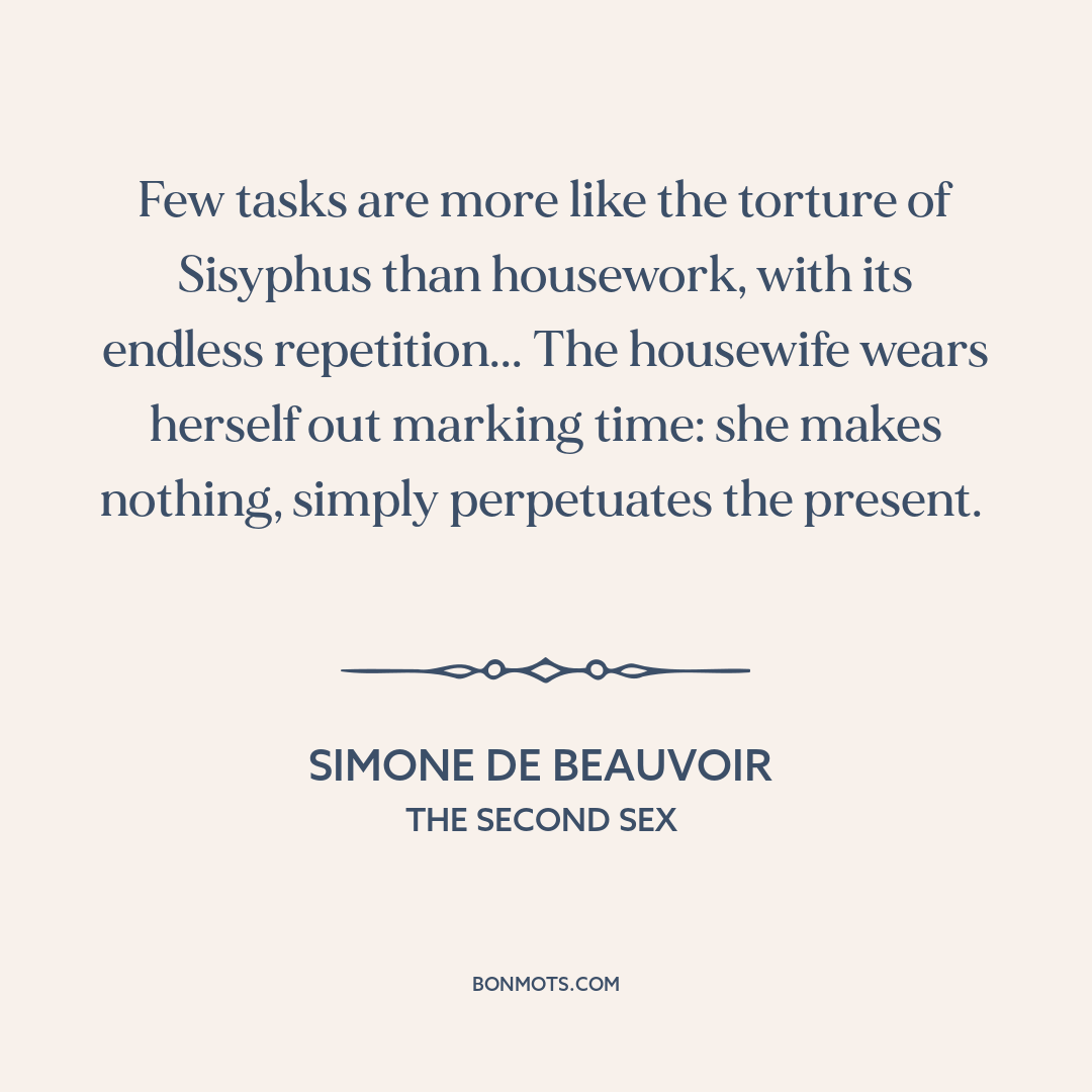 Few tasks are more like the torture of Sisyphus than housework, with its endless repetition... The housewife wears herself out marking time: she makes nothing, simply perpetuates the present.