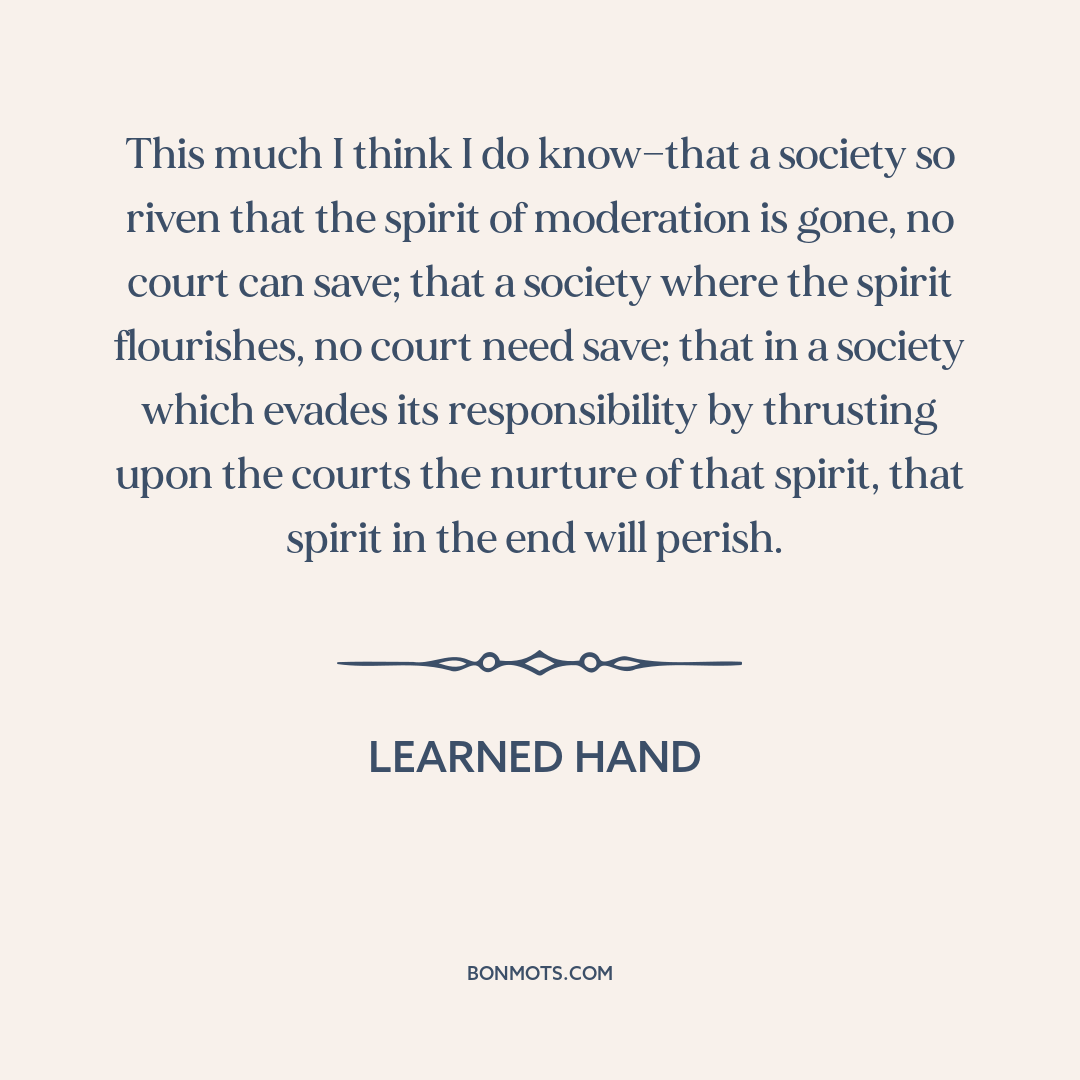 This much I think I do know—that a society so riven that the spirit of moderation is gone, no court can save; that a society where the spirit flourishes, no court need save; that in a society which evades its responsibility by thrusting upon the courts the nurture of that spirit, that spirit in the end will perish.