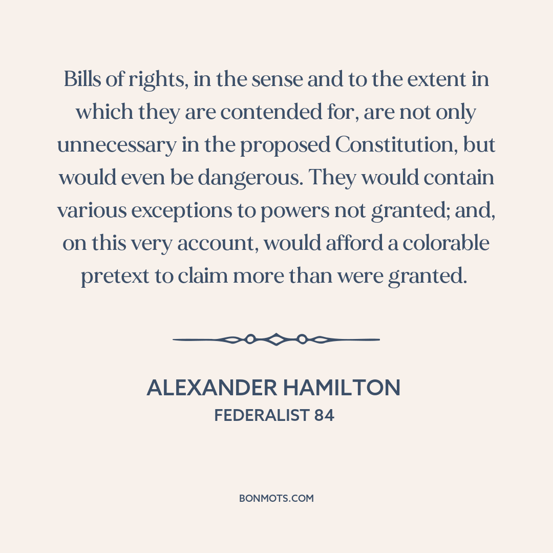 Bills of rights, in the sense and to the extent in which they are contended for, are not only unnecessary in the proposed Constitution, but would even be dangerous. They would contain various exceptions to powers not granted; and, on this very account, would afford a colorable pretext to claim more than were granted.