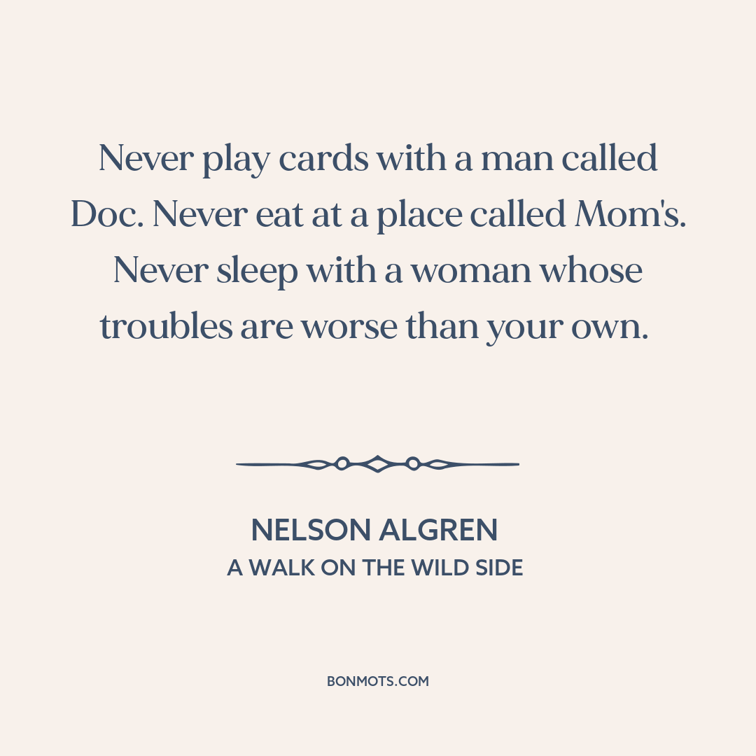 Never play cards with a man called Doc. Never eat at a place called Mom's. Never sleep with a woman whose troubles are worse than your own.