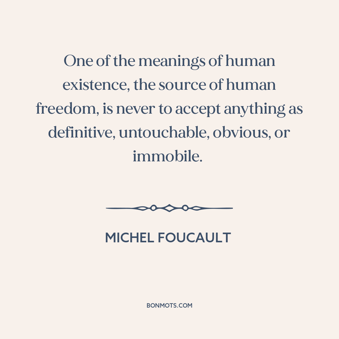 One of the meanings of human existence, the source of human freedom, is never to accept anything as definitive, untouchable, obvious, or immobile.