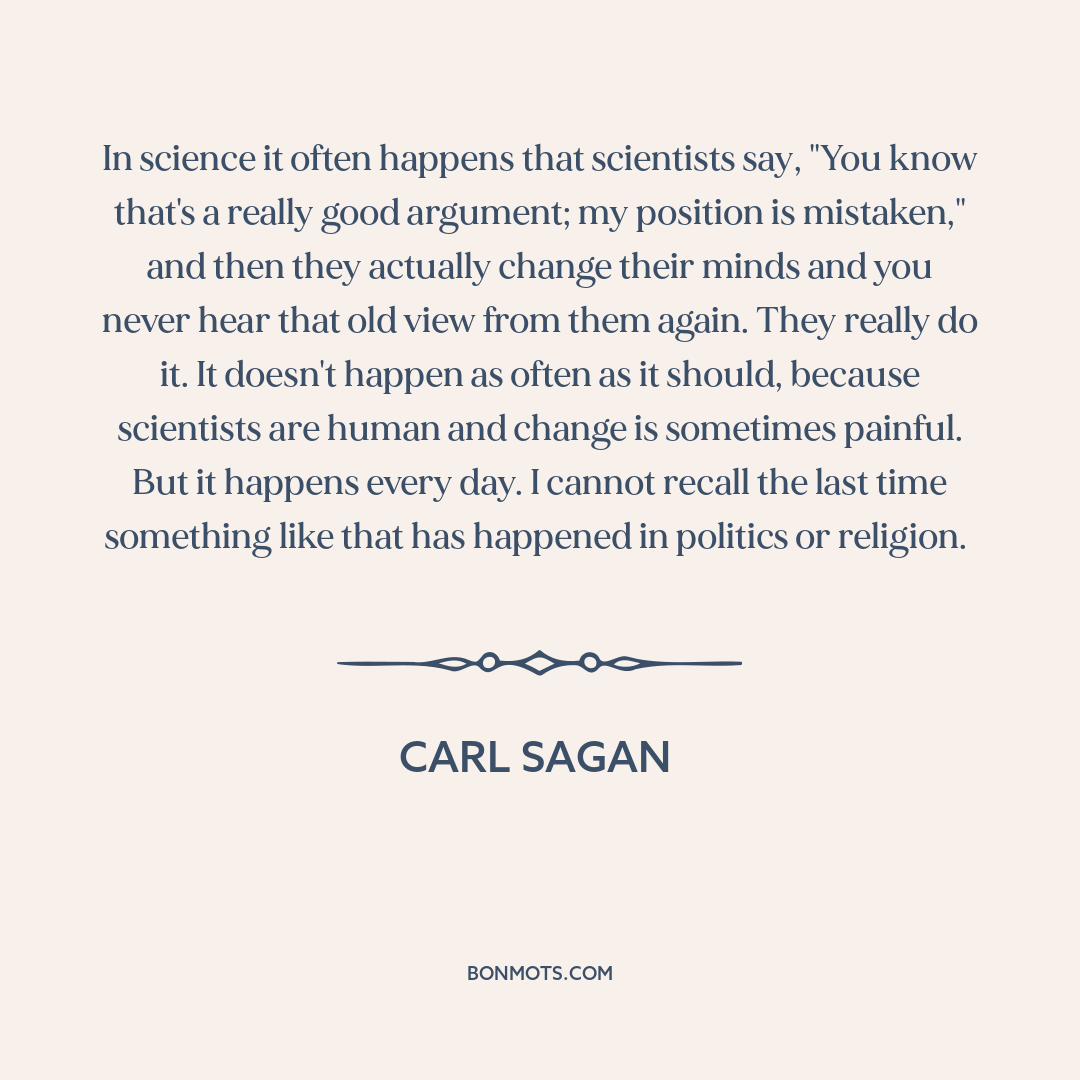In science it often happens that scientists say, "You know that's a really good argument; my position is mistaken," and then they actually change their minds and you never hear that old view from them again. They really do it. It doesn't happen as often as it should, because scientists are human and change is sometimes painful. But it happens every day. I cannot recall the last time something like that has happened in politics or religion.
