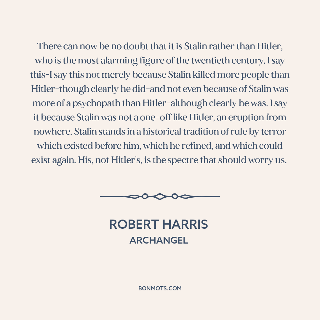 There can now be no doubt that it is Stalin rather than Hitler, who is the most alarming figure of the twentieth century. I say this-I say this not merely because Stalin killed more people than Hitler-though clearly he did-and not even because of Stalin was more of a psychopath than Hitler-although clearly he was. I say it because Stalin was not a one-off like Hitler, an eruption from nowhere. Stalin stands in a historical tradition of rule by terror which existed before him, which he refined, and which could exist again. His, not Hitler's, is the spectre that should worry us.