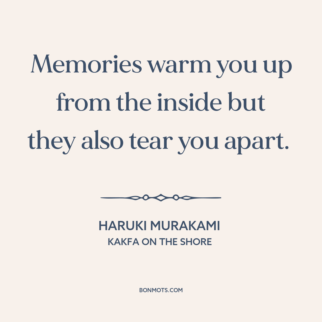 Memories warm you up from the inside but they also tear you apart. Haruki Murakami Kakfa on the Shore There are no other quotes from this source in the Bon Mots database. Buy Kafka on the Shore at Amazon Buy Kafka on the Shore at Amazon Instagram sharing coming soon. Quote text and source copied to clipboard. Link to this quote copied to clipboard. More information about this quote Topic Memories Nostalgia The past Author Haruki Murakami Source Kakfa on the Shore Medium Novel Language Japanese Time 2002 2000s 21st century Occupation Novelist Writer From Japan Asia Authentication Score 3 More information on Authentication Score coming soon. Citation Murakami, Haruki. 海辺のカフカ [Kafka on the Shore]. Shinchosha, 2002. Citation text copied to clipboard.
