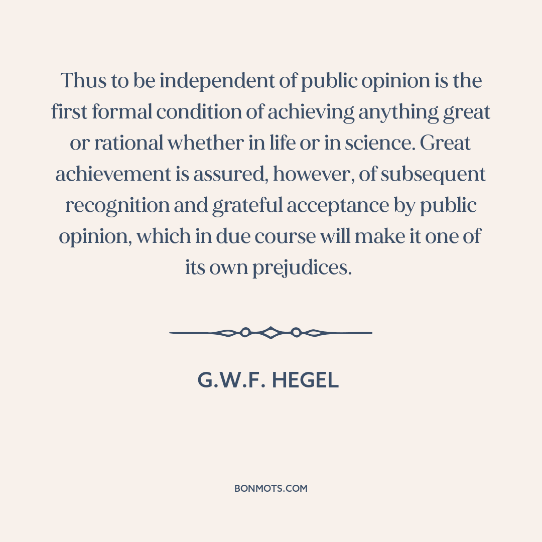 Thus to be independent of public opinion is the first formal condition of achieving anything great or rational whether in life or in science. Great achievement is assured, however, of subsequent recognition and grateful acceptance by public opinion, which in due course will make it one of its own prejudices.