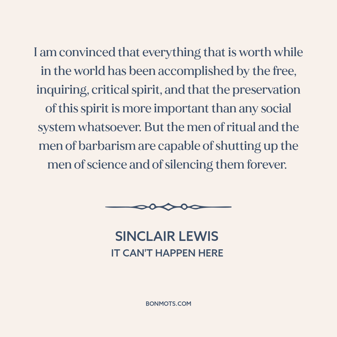 I am convinced that everything that is worth while in the world has been accomplished by the free, inquiring, critical spirit, and that the preservation of this spirit is more important than any social system whatsoever. But the men of ritual and the men of barbarism are capable of shutting up the men of science and of silencing them forever.