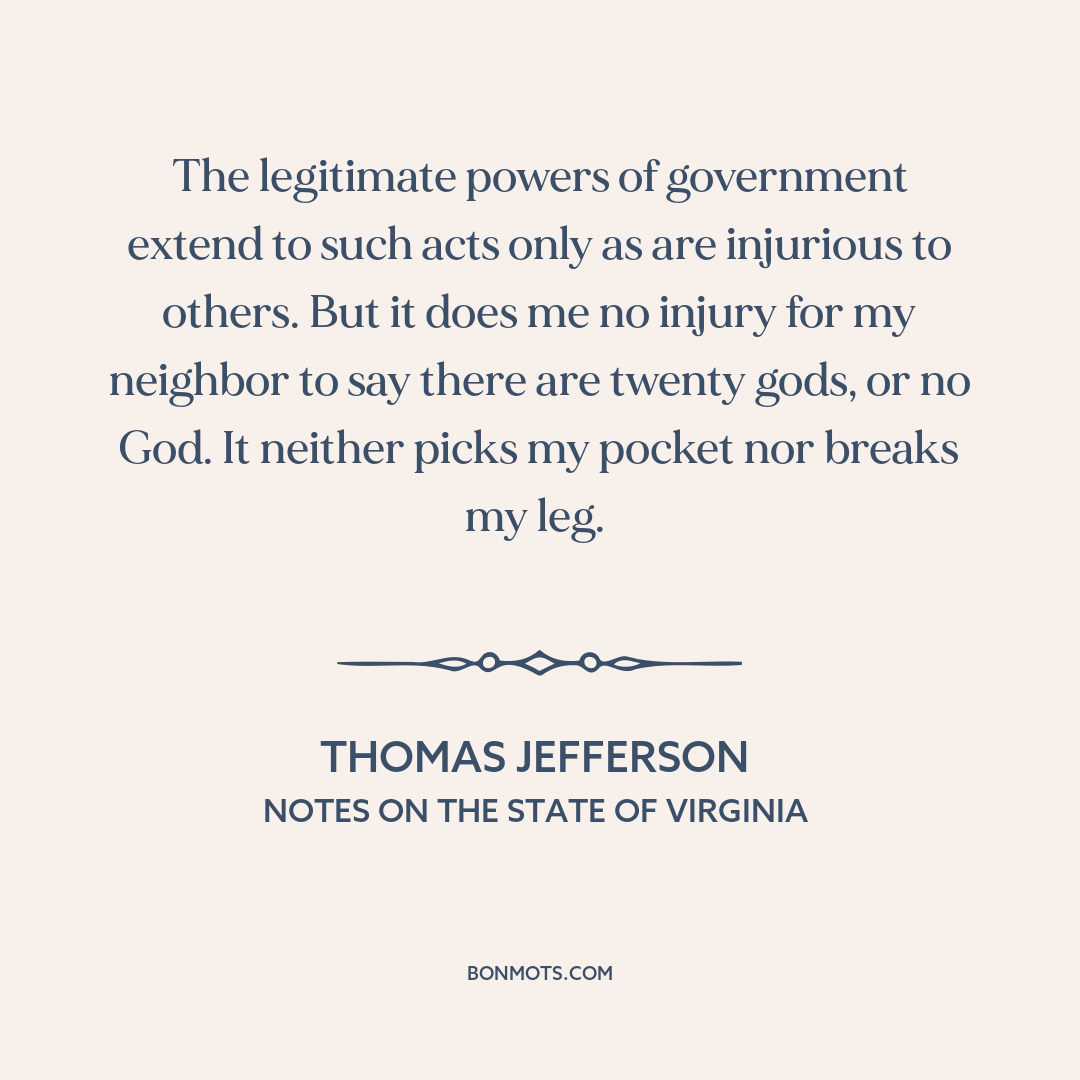 The legitimate powers of government extend to such acts only as are injurious to others. But it does me no injury for my neighbor to say there are twenty gods, or no God. It neither picks my pocket nor breaks my leg.