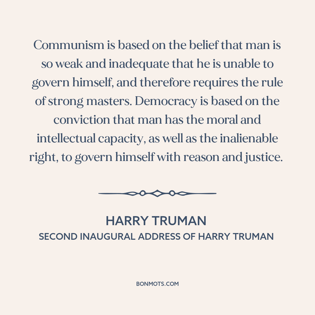 Communism is based on the belief that man is so weak and inadequate that he is unable to govern himself, and therefore requires the rule of strong masters. Democracy is based on the conviction that man has the moral and intellectual capacity, as well as the inalienable right, to govern himself with reason and justice.
