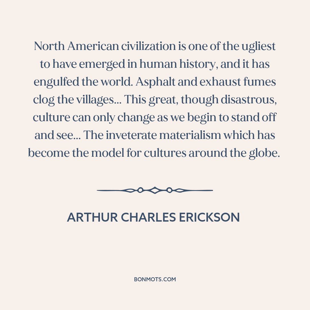 North American civilization is one of the ugliest to have emerged in human history, and it has engulfed the world. Asphalt and exhaust fumes clog the villages... This great, though disastrous, culture can only change as we begin to stand off and see... The inveterate materialism which has become the model for cultures around the globe.