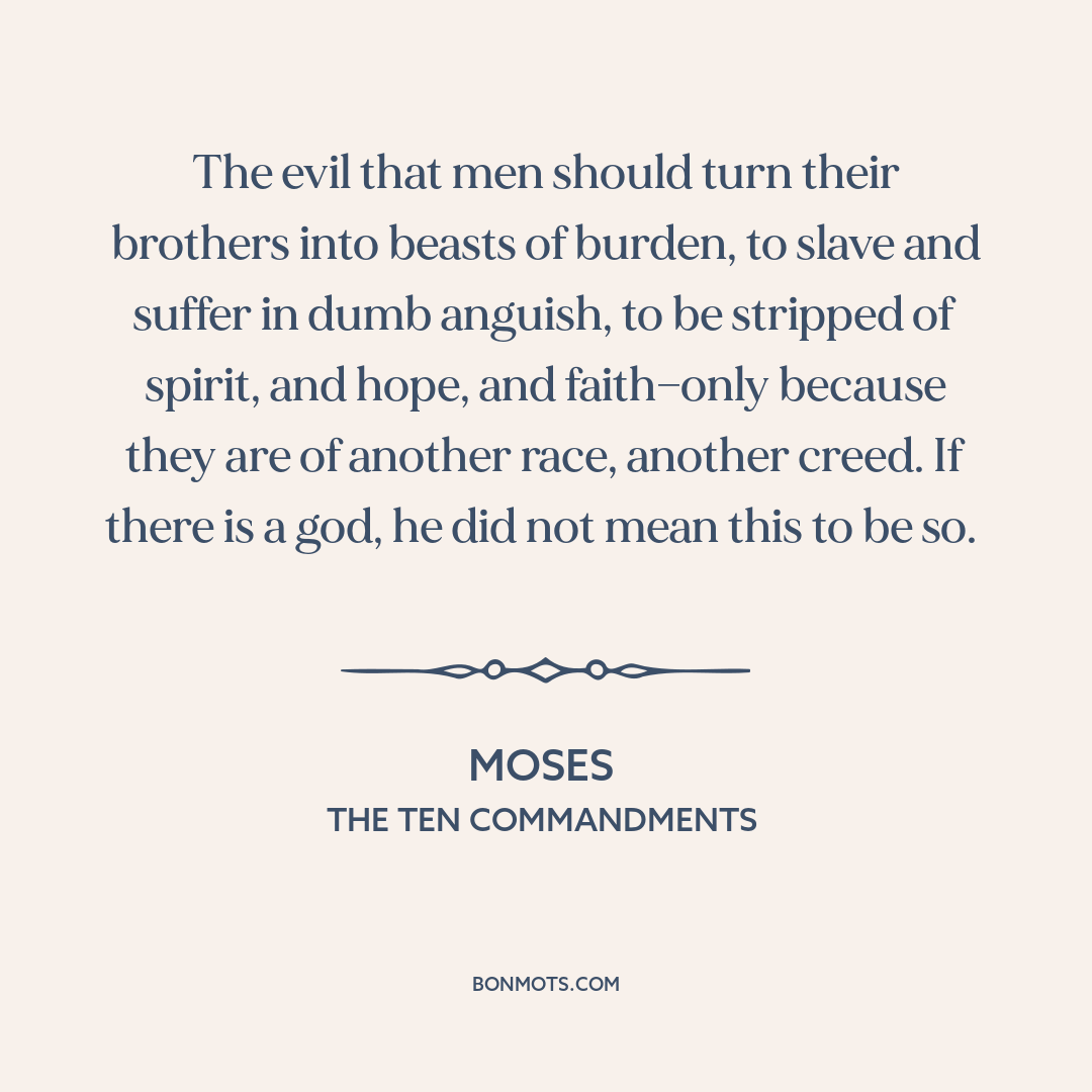 The evil that men should turn their brothers into beasts of burden, to slave and suffer in dumb anguish, to be stripped of spirit, and hope, and faith—only because they are of another race, another creed. If there is a god, he did not mean this to be so.