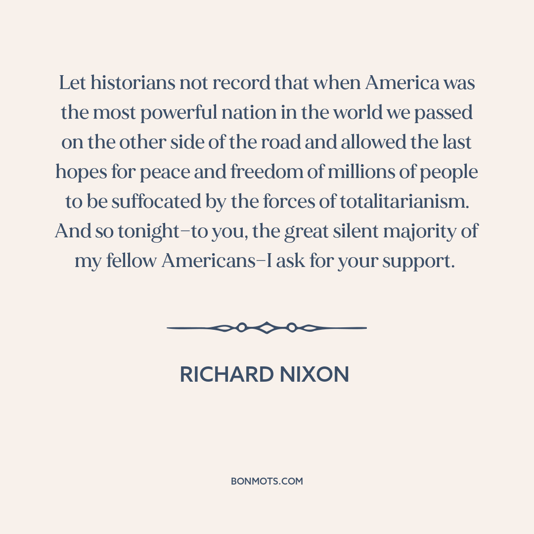 Let historians not record that when America was the most powerful nation in the world we passed on the other side of the road and allowed the last hopes for peace and freedom of millions of people to be suffocated by the forces of totalitarianism. And so tonight—to you, the great silent majority of my fellow Americans—I ask for your support.