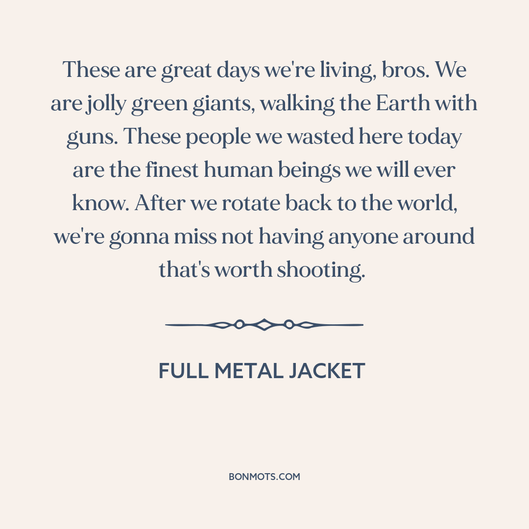 These are great days we're living, bros. We are jolly green giants, walking the Earth with guns. These people we wasted here today are the finest human beings we will ever know. After we rotate back to the world, we're gonna miss not having anyone around that's worth shooting.