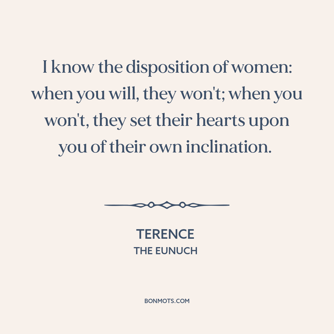 I know the disposition of women: when you will, they won't; when you won't, they set their hearts upon you of their own inclination.