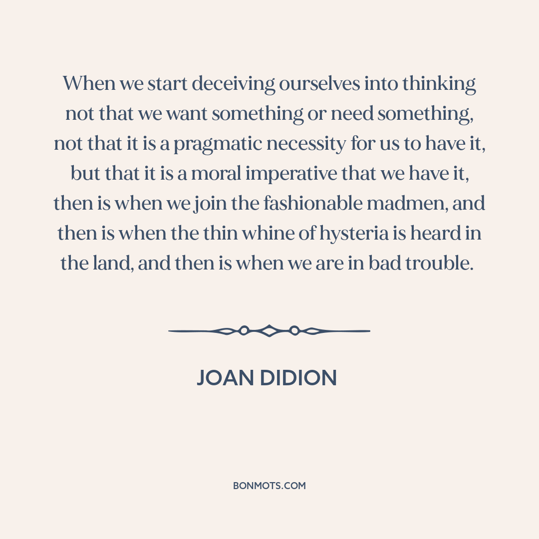 When we start deceiving ourselves into thinking not that we want something or need something, not that it is a pragmatic necessity for us to have it, but that it is a moral imperative that we have it, then is when we join the fashionable madmen, and then is when the thin whine of hysteria is heard in the land, and then is when we are in bad trouble.