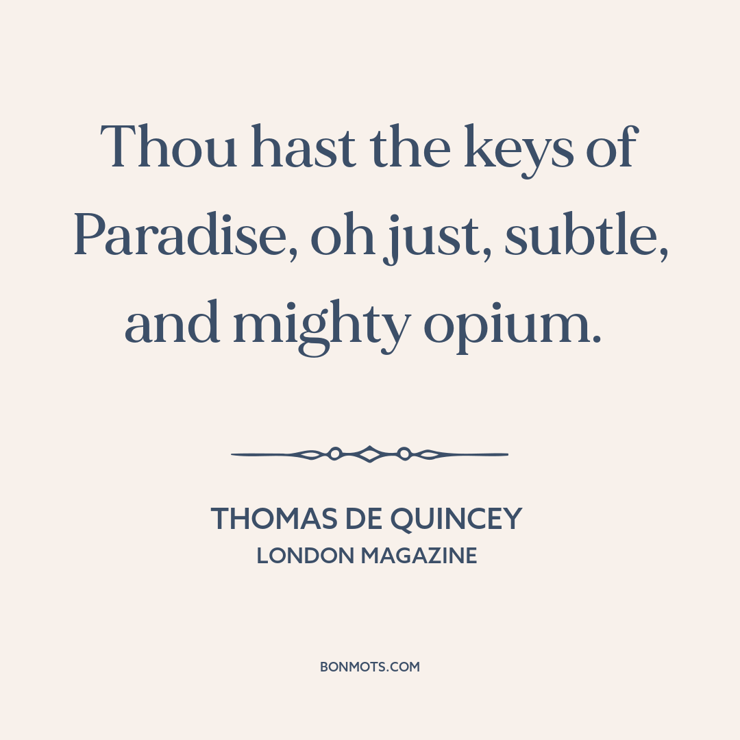 Thou hast the keys of Paradise, oh just, subtle, and mighty opium.