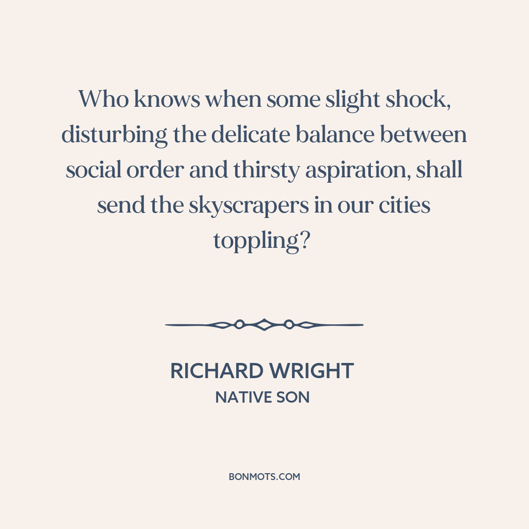 Who knows when some slight shock, disturbing the delicate balance between social order and thirsty aspiration, shall send the skyscrapers in our cities toppling?