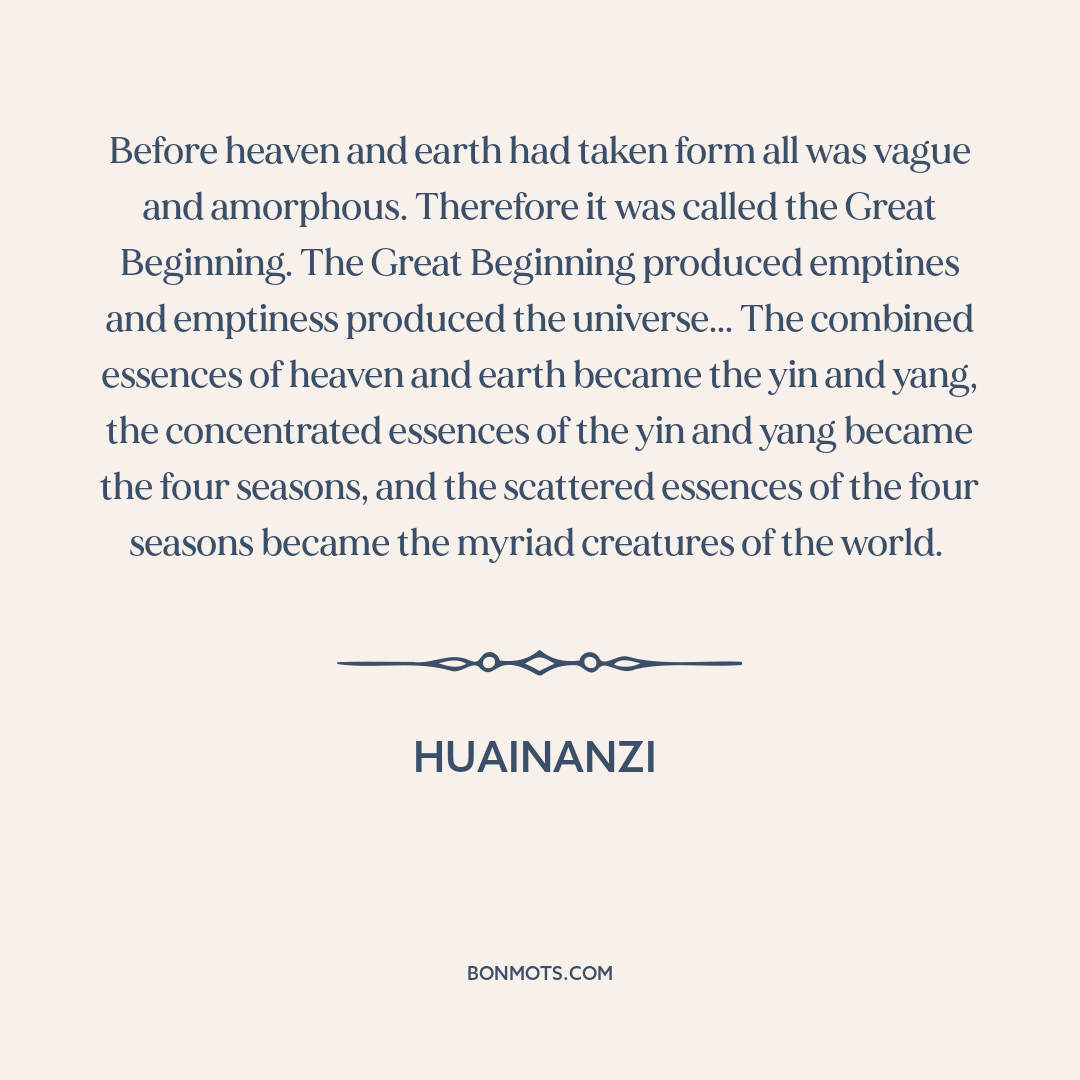 Before heaven and earth had taken form all was vague and amorphous. Therefore it was called the Great Beginning. The Great Beginning produced emptines and emptiness produced the universe... The combined essences of heaven and earth became the yin and yang, the concentrated essences of the yin and yang became the four seasons, and the scattered essences of the four seasons became the myriad creatures of the world.