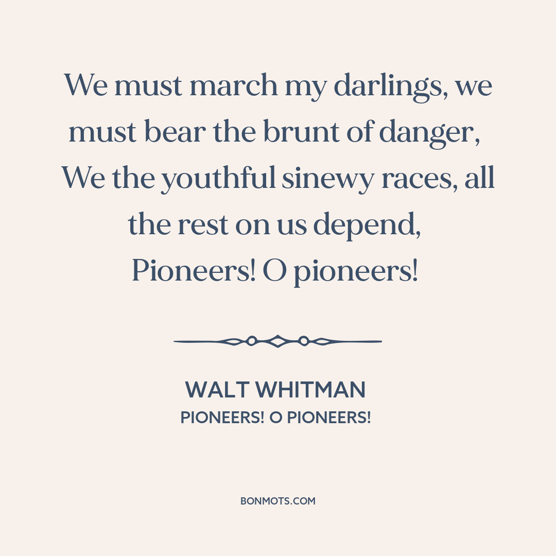 Whitman, Walt. "Pioneers! O Pioneers!" Leaves of Grass. New York: Self-published, 1867, st. 2. Originally published in Drum-Taps. New York: Peter Eckler, 1865, st. 2.
