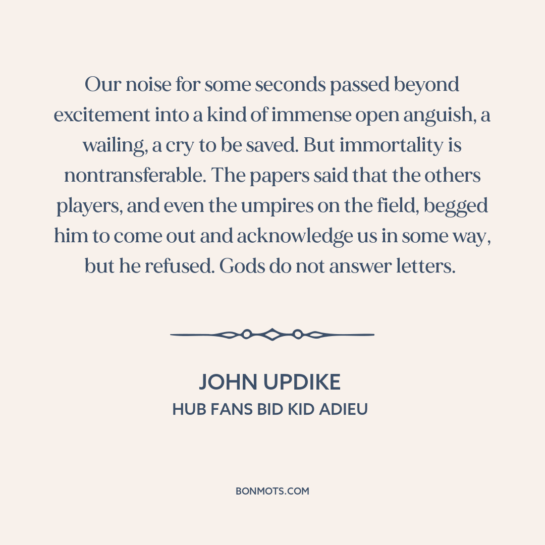 Our noise for some seconds passed beyond excitement into a kind of immense open anguish, a wailing, a cry to be saved. But immortality is nontransferable. The papers said that the others players, and even the umpires on the field, begged him to come out and acknowledge us in some way, but he refused. Gods do not answer letters.