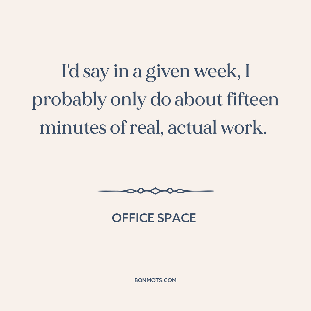 I'd say in a given week, I probably only do about fifteen minutes of real, actual work. Office Space Watch Office Space at Amazon Watch Office Space at Amazon Instagram sharing coming soon. Quote text and source copied to clipboard. Link to this quote copied to clipboard. More information about this quote Topic Work Speaker Peter Gibbons Actor Ron Livingston Source Office Space Medium Film Genre Comedy (film) Comedy Language English Time 1999 1990s 20th century Authentication Score 3 More information on Authentication Score coming soon. Citation Office Space. Directed by Mike Judge, Judgemental Films, 1999. Citation text copied to clipboard.