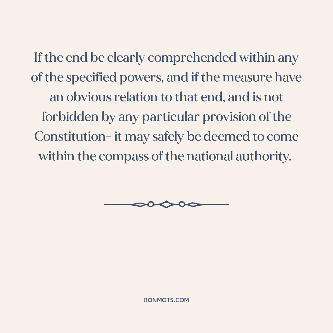 If the end be clearly comprehended within any of the specified powers, and if the measure have an obvious relation to that end, and is not forbidden by any particular provision of the Constitution- it may safely be deemed to come within the compass of the national authority.