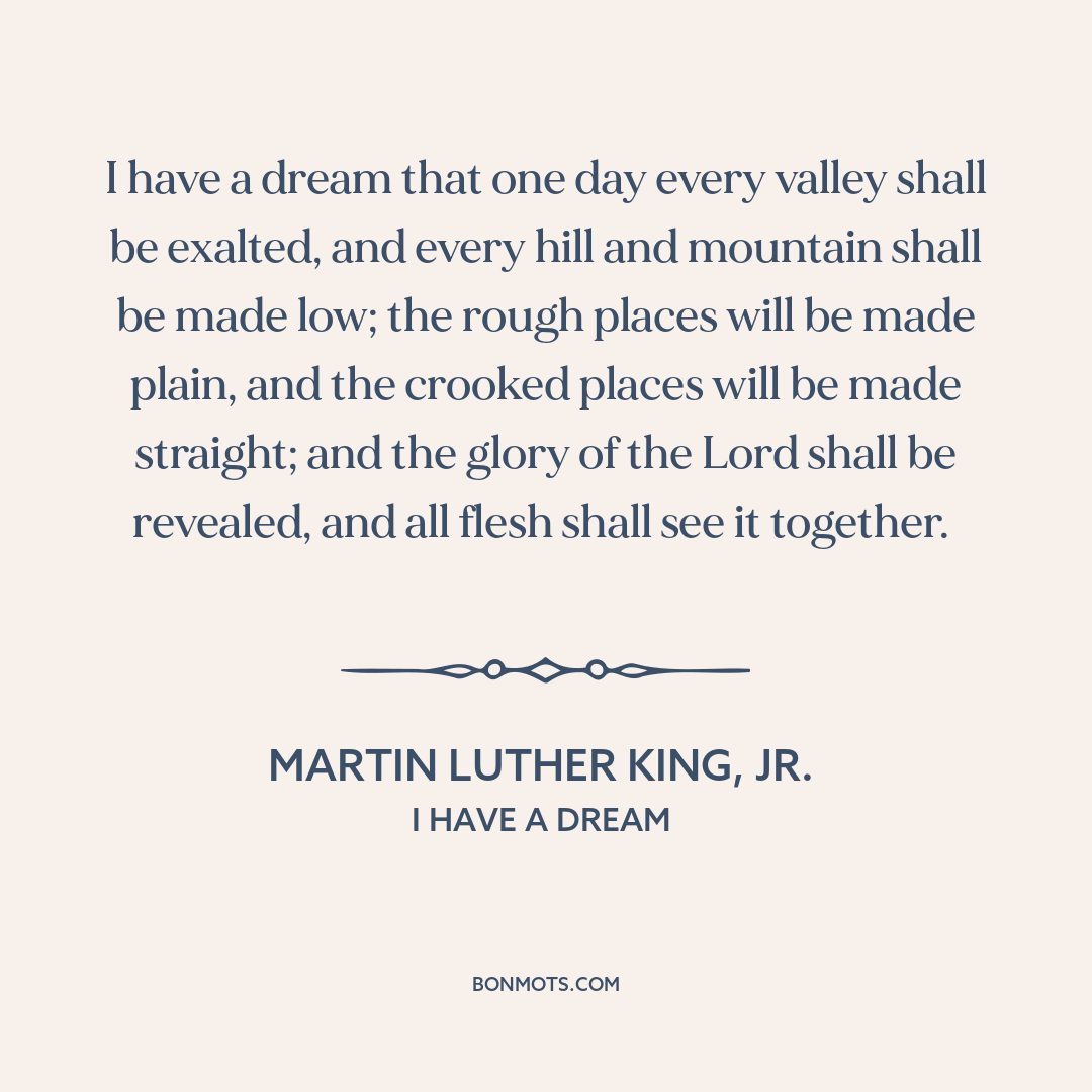 I have a dream that one day every valley shall be exalted, and every hill and mountain shall be made low; the rough places will be made plain, and the crooked places will be made straight; and the glory of the Lord shall be revealed, and all flesh shall see it together.