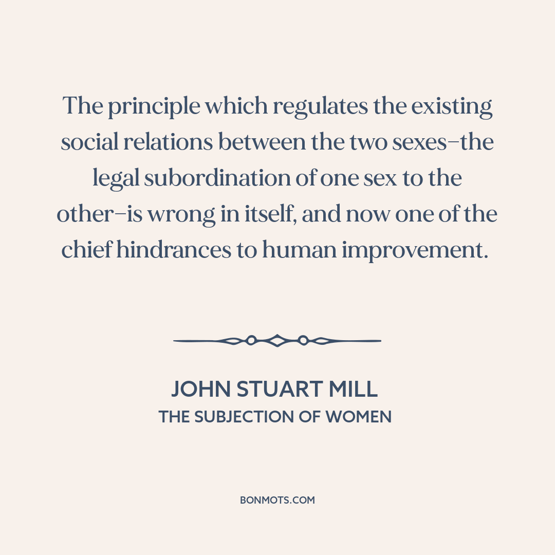 The principle which regulates the existing social relations between the two sexes—the legal subordination of one sex to the other—is wrong in itself, and now one of the chief hindrances to human improvement.
