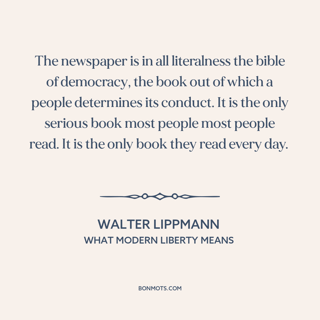 The newspaper is in all literalness the bible of democracy, the book out of which a people determines its conduct. It is the only serious book most people most people read. It is the only book they read every day.