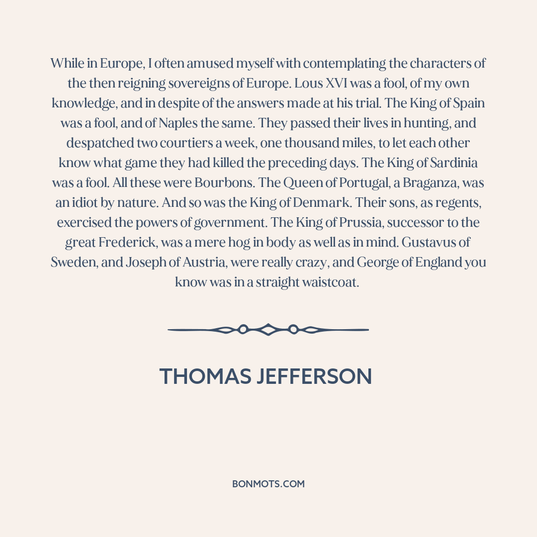 While in Europe, I often amused myself with contemplating the characters of the then reigning sovereigns of Europe. Lous XVI was a fool, of my own knowledge, and in despite of the answers made at his trial. The King of Spain was a fool, and of Naples the same. They passed their lives in hunting, and despatched two courtiers a week, one thousand miles, to let each other know what game they had killed the preceding days. The King of Sardinia was a fool. All these were Bourbons. The Queen of Portugal, a Braganza, was an idiot by nature. And so was the King of Denmark. Their sons, as regents, exercised the powers of government. The King of Prussia, successor to the great Frederick, was a mere hog in body as well as in mind. Gustavus of Sweden, and Joseph of Austria, were really crazy, and George of England you know was in a straight waistcoat.