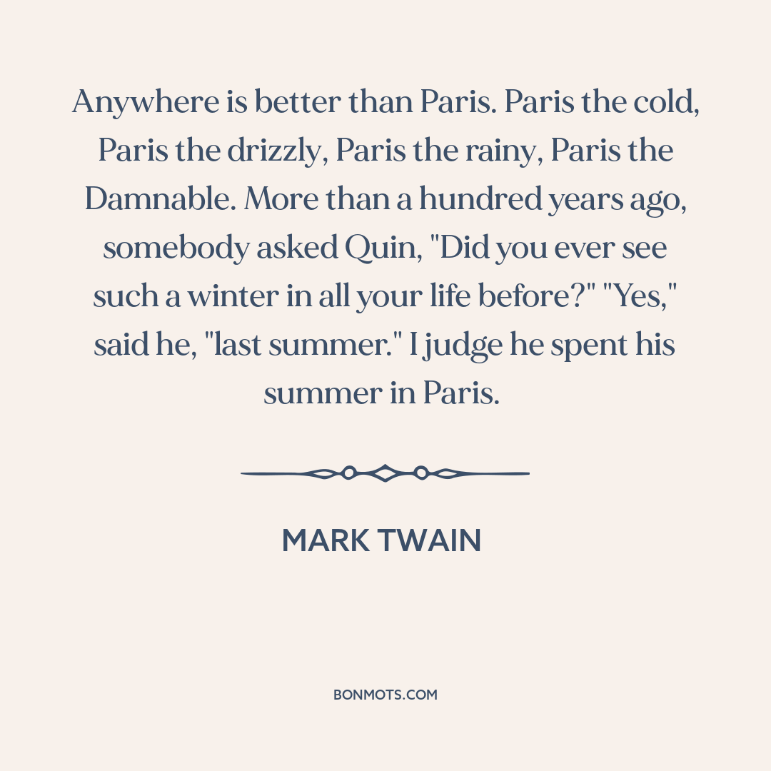 Anywhere is better than Paris. Paris the cold, Paris the drizzly, Paris the rainy, Paris the Damnable. More than a hundred years ago, somebody asked Quin, "Did you ever see such a winter in all your life before?" "Yes," said he, "last summer." I judge he spent his summer in Paris.