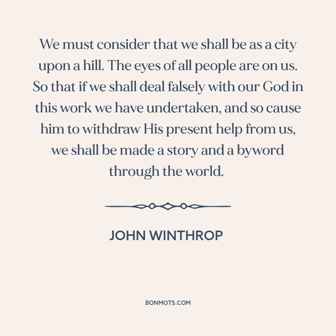We must consider that we shall be as a city upon a hill. The eyes of all people are on us. So that if we shall deal falsely with our God in this work we have undertaken, and so cause him to withdraw His present help from us, we shall be made a story and a byword through the world.