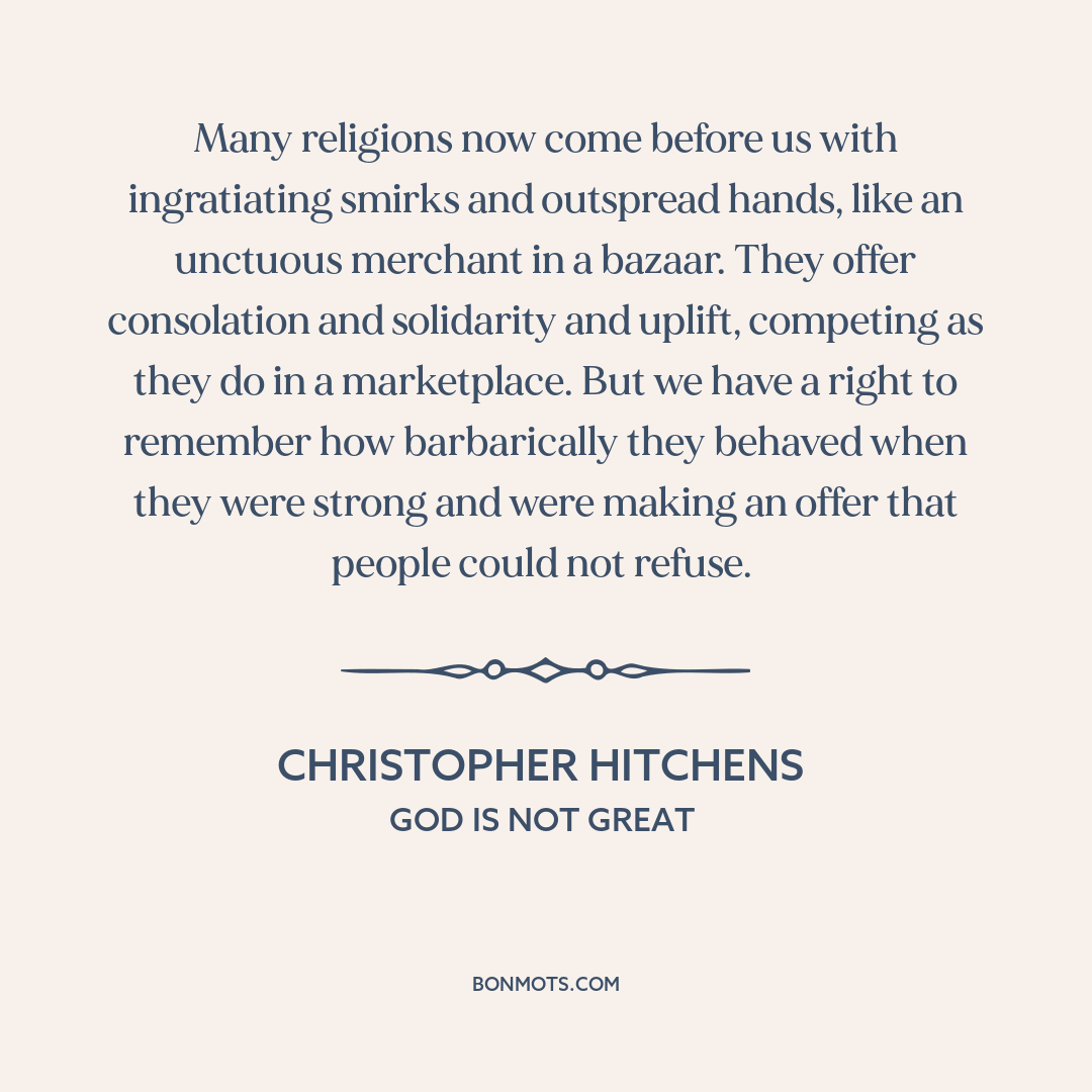Many religions now come before us with ingratiating smirks and outspread hands, like an unctuous merchant in a bazaar. They offer consolation and solidarity and uplift, competing as they do in a marketplace. But we have a right to remember how barbarically they behaved when they were strong and were making an offer that people could not refuse.