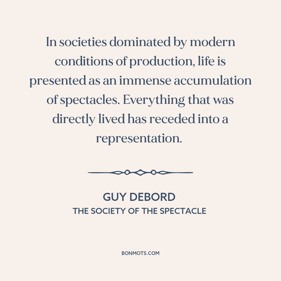 Toute la vie des sociétés dans lesquelles règnent les conditions modernes de production s’annonce comme une immense accumulation de spectacles. Tout ce qui était directement vécu s’est éloigné dans une représentation.